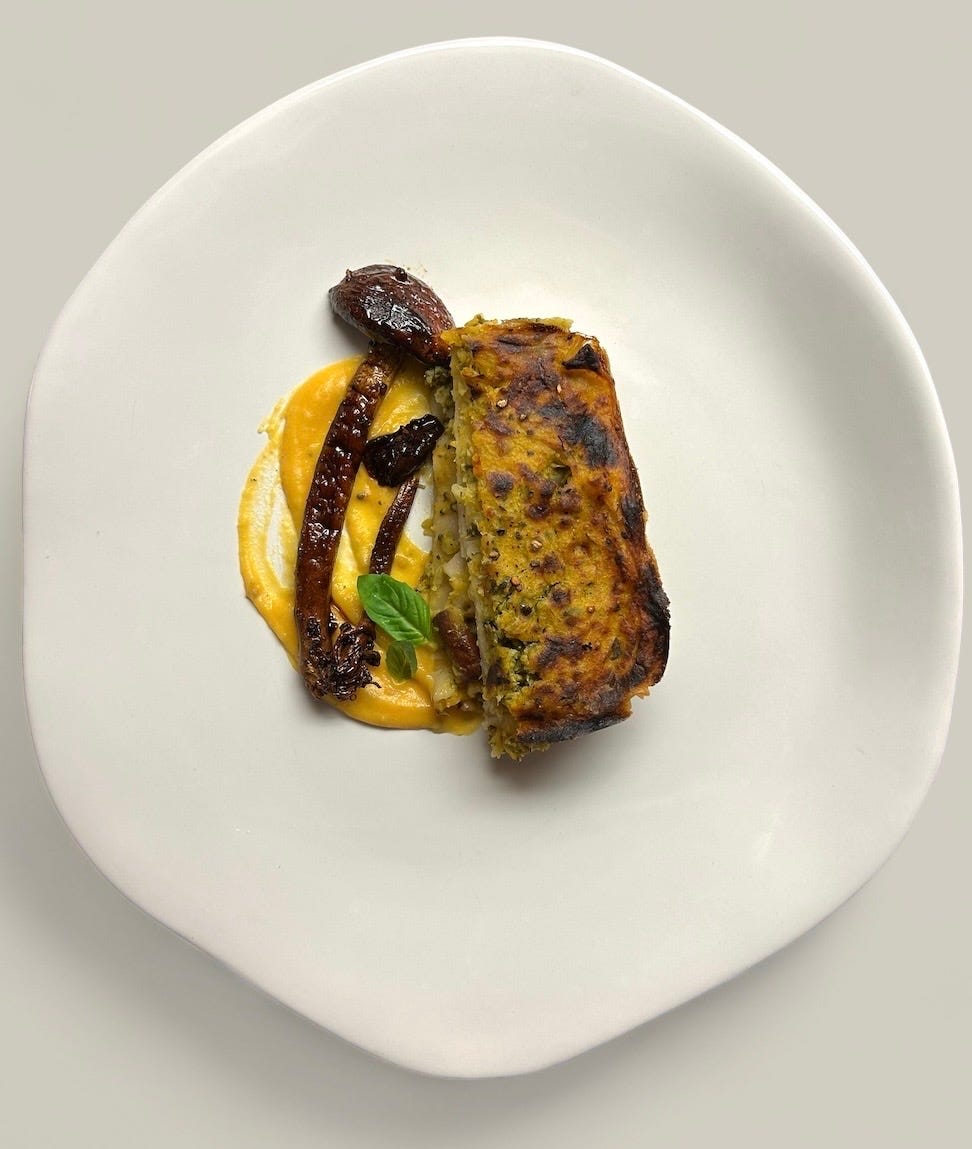 In a loaf pan, grease a loaf pan with olive oil and put a thin layer of cheese sauce on the bottom. Add a lasagna sheet, then a layer of pesto, mushrooms, and more cheese sauce. Repeat these steps until all the noodles are gone.