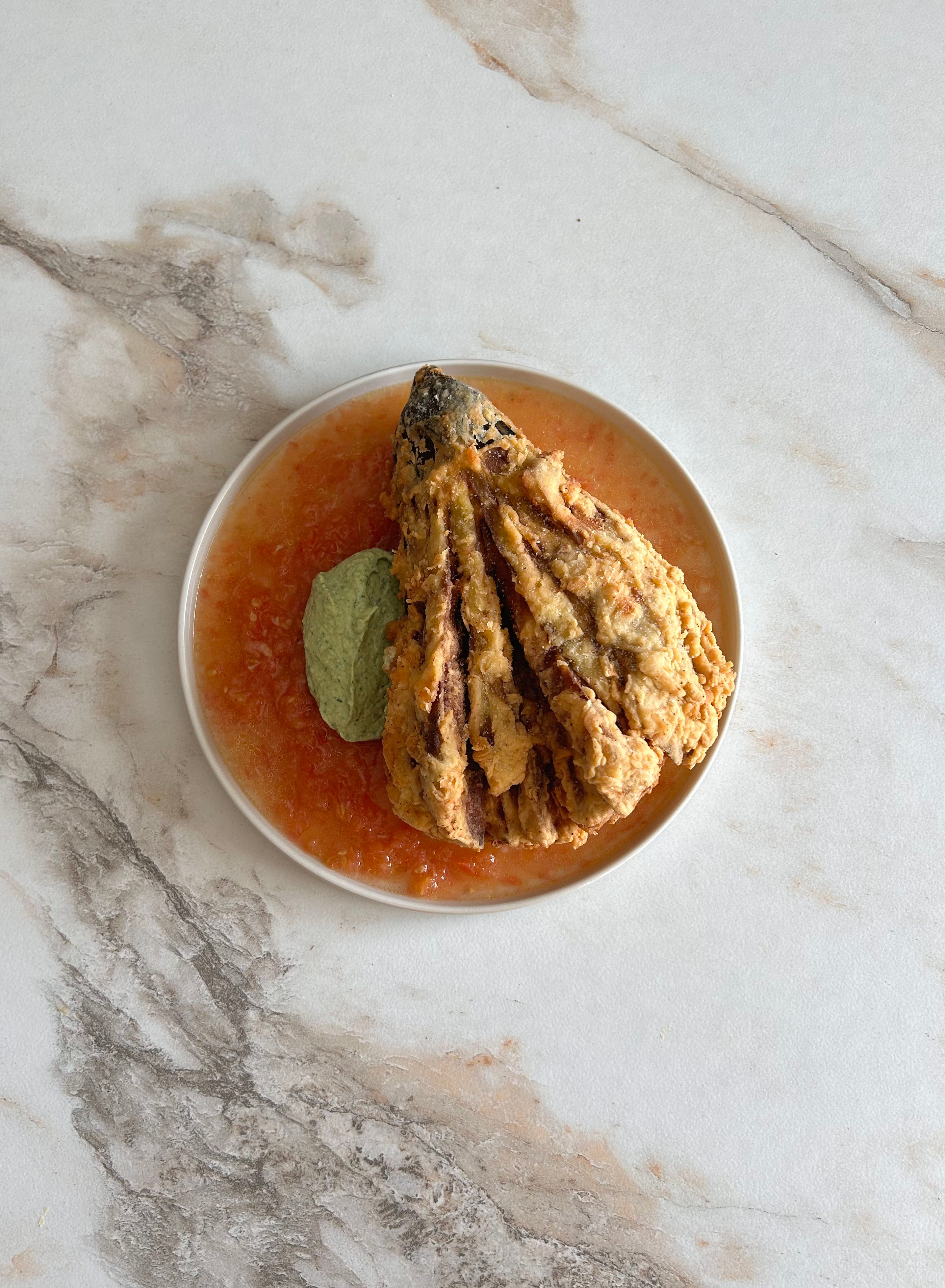 To serve, spoon tomato sauce on a plate, lay the fried eggplant, then top with the basil pine nut ricotta!